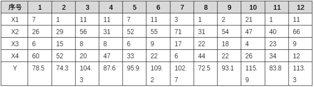 X=[7,26,6,60;1,29,15,52;11,56,8,20;11,31,8,47;7,52,6,33;11,55,9,22;3,71,17,6;1,31,22,44;2,54,18,22;21,47,4,26;1,40,23,34;11,66,9,12]; %自变量数据