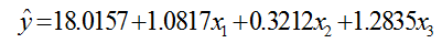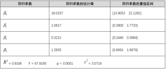 计算结果包括回归系数 b = (β0,β1,β2,β3) = (18.0157, 1.0817, 0.3212, 1.2835)、回归系数的置信区间,以及统计变量 stats(它包含四个检验统计量:相关系数的平方R^2,假设检验统计量 F,与 F 对应的概率 p,s^2 的值)。因此我们得到初步的回归方程为: