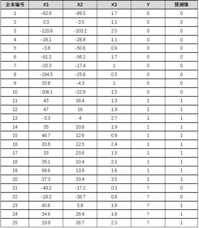 [ 例5 ] 企业到金融商业机构贷款,金融商业机构需要对企业进行评估。评估结果为 0 , 1 两种形式,0 表示企业两年后破产,将拒绝贷款,而 1 表示企业 2 年后具备还款能力,可以贷款。在表 6 中,已知前 20 家企业的三项评价指标值和评估结果,试建立模型对其他 5 家企业(企业 21-25)进行评估。
