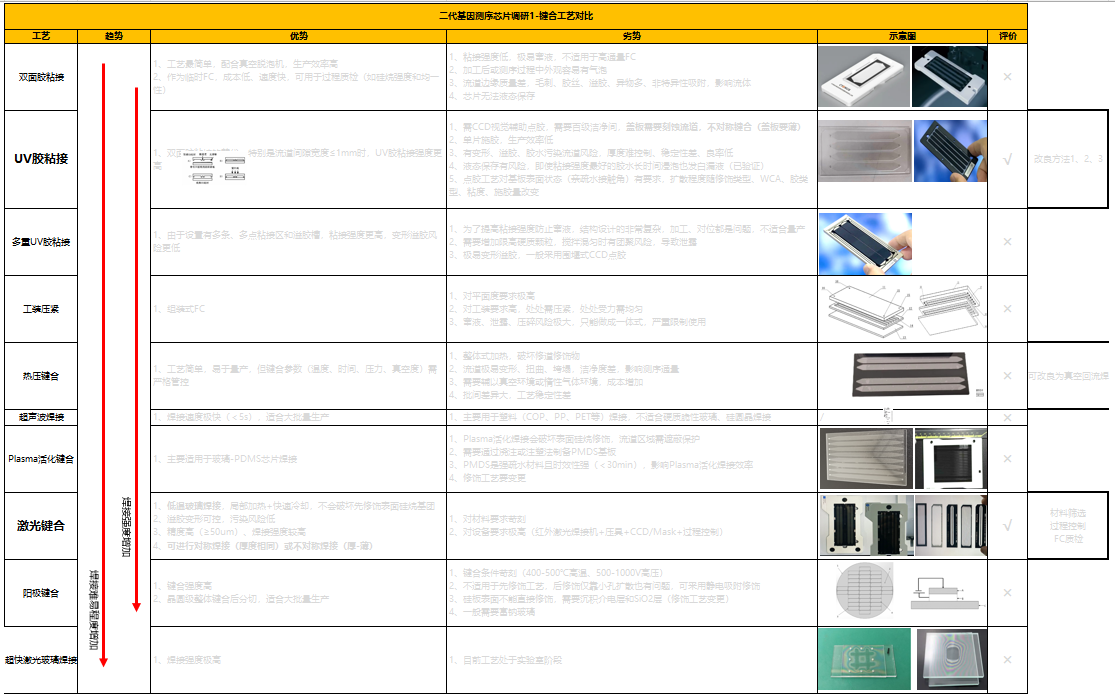 在此主要讲一下flowcell量产问题。Flowcell加工工艺包括但不限于双面胶粘接、胶水粘接、多重胶水粘接、工装压紧、热压键和、超声波键合、Plasma活化键合、阳极键合、激光辅助检核、玻璃-玻璃直接激光键合、化学直接键合等。
