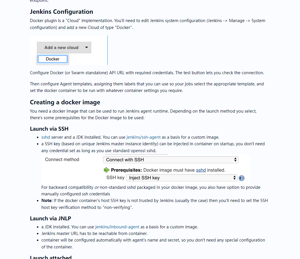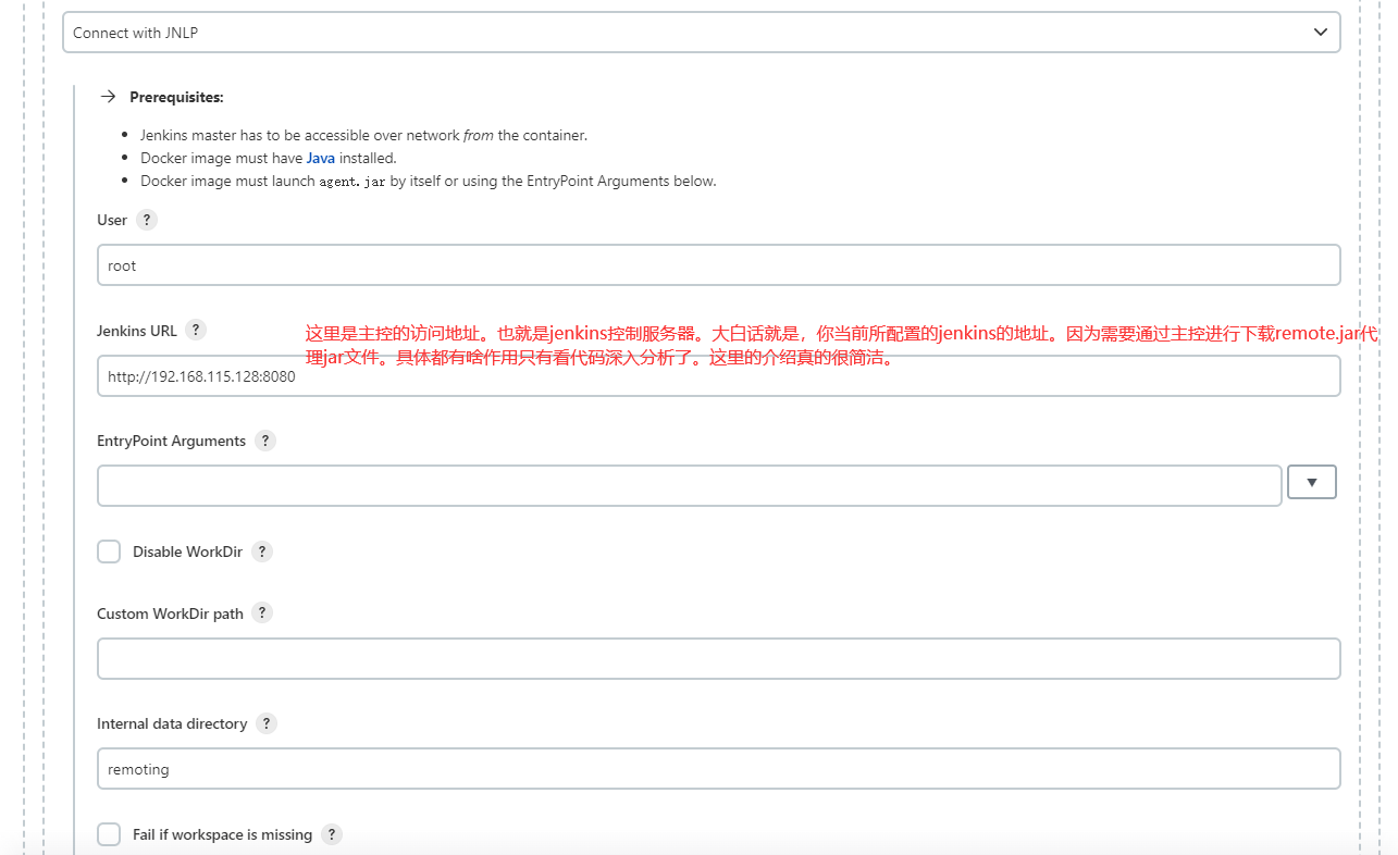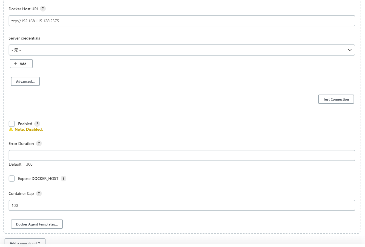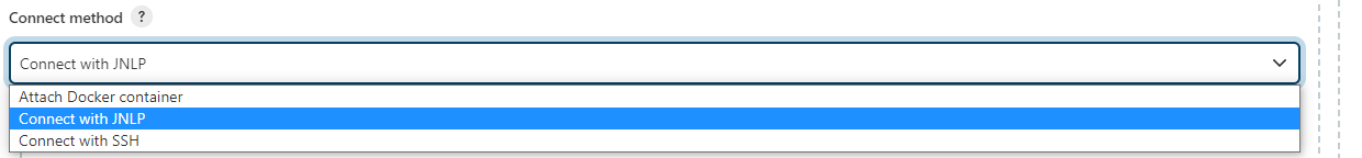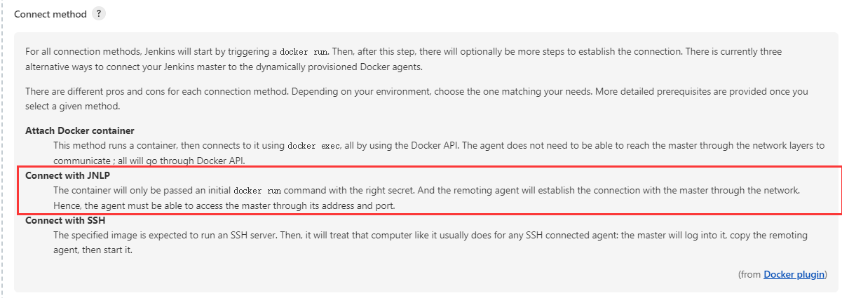 这里与Docker插件,jenkins代理镜像是有关的。需要注意。当选择不通的连接方式,需要看下是否满足前置要求。
