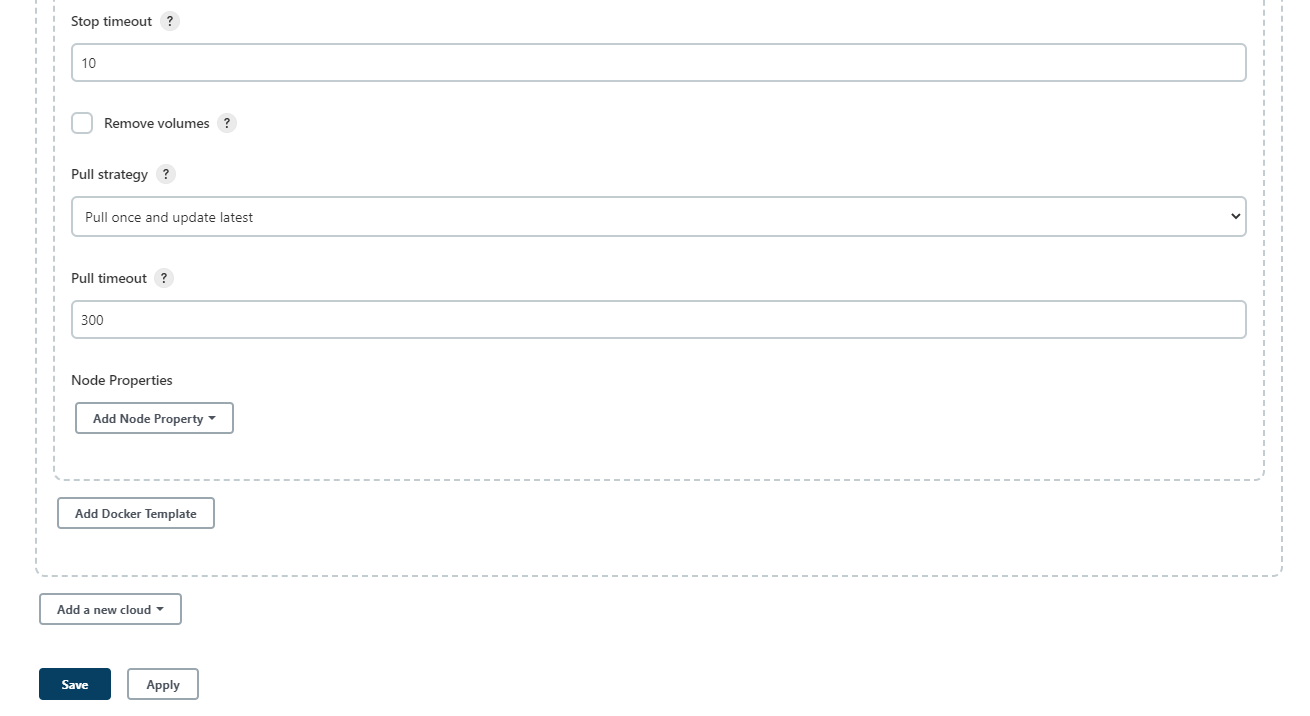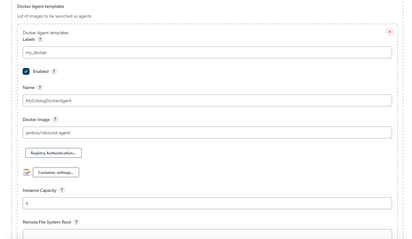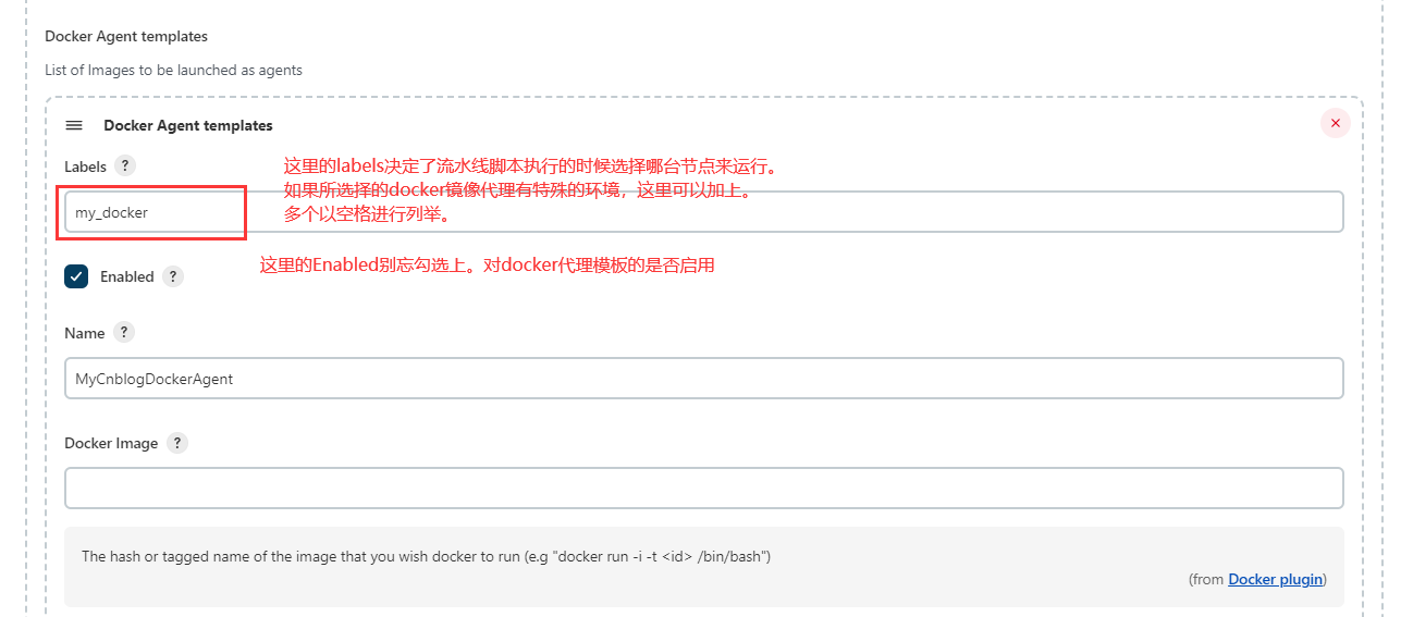 我对这里的配置项,DockerTemplate就是进行docker run <镜像> <args>各种参数的配置。然后当jenkins需要启动docker容器的时候,会根据你这里配置的模板进行启动。