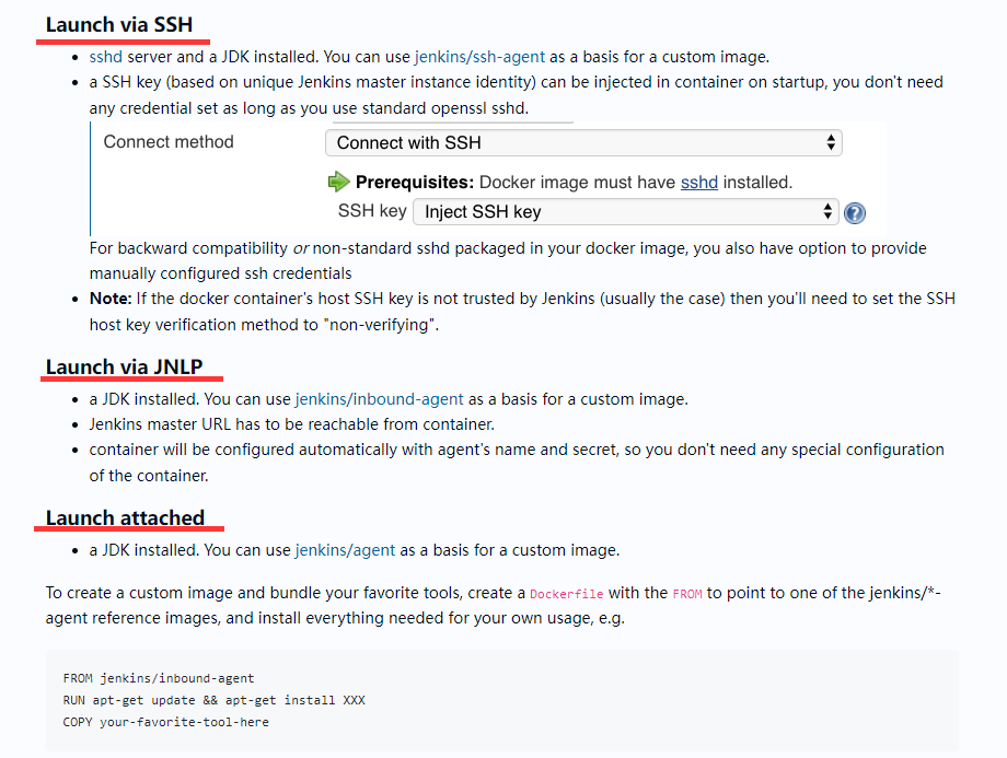 提供了三种创建docker代理的方式。这里我们使用 JNLP 代理启动的方式。