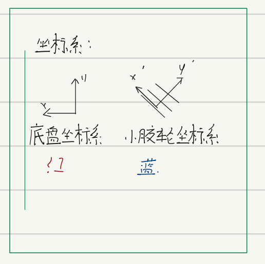先把小车整体速度分解到单个麦轮上。这里坐标系为底盘坐标系