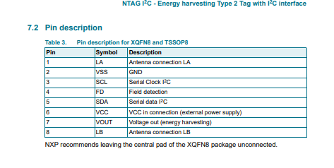 NXP公司的NTAG系列连接型NFC标签就为许多电子设备增加了即触即连的功能。本设计根据应用需要,综合成本因素及板面布局,选用NXP公司NTAG系列 NT3H1101W0FHKH NFC芯片作为卡片交互核心。芯片采用XQFN-8封装,十分小巧。