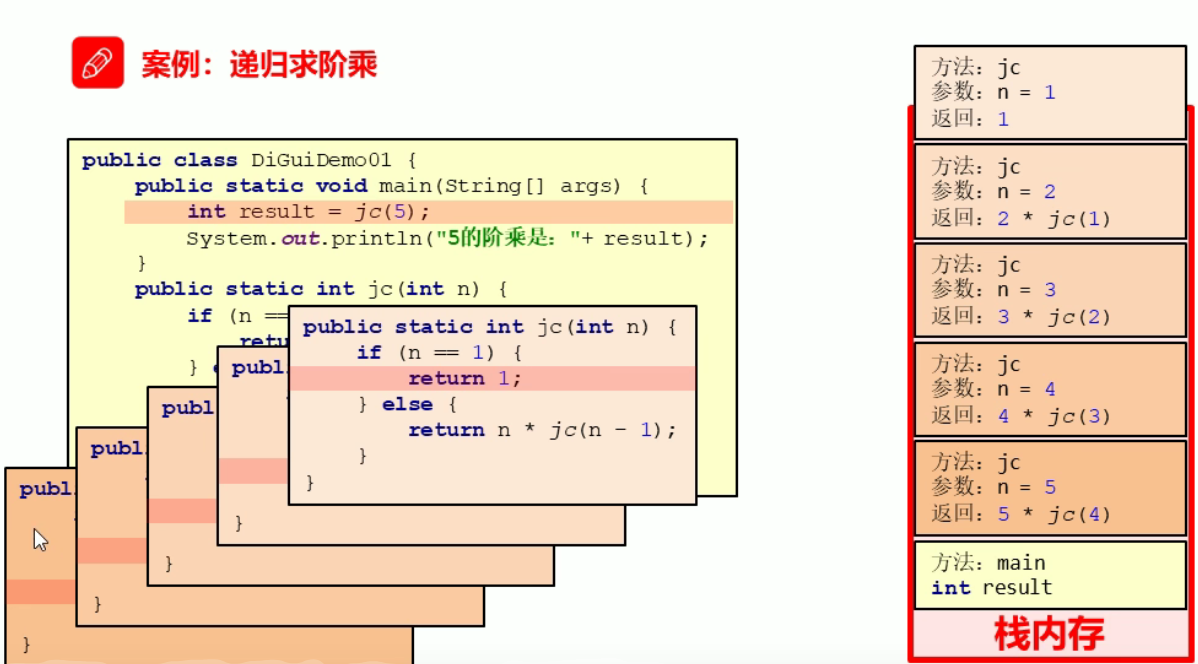- 递归的概述:以编程的角度来看,递归指的是方法定义中调用方法本身的现象
