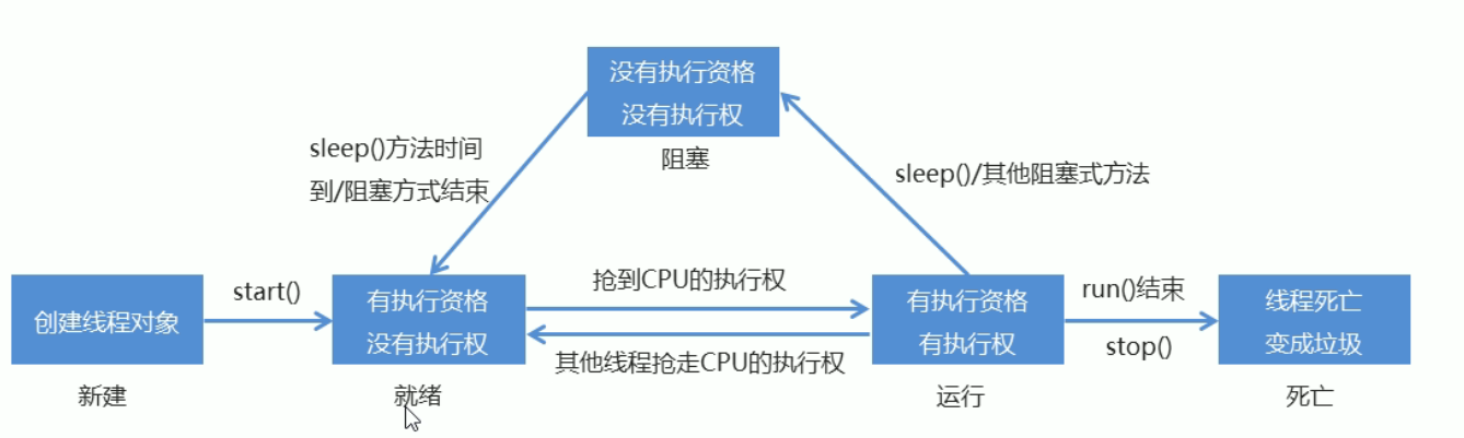 - 假如计算机只有一个CPU,那么CPU在某一个时刻只能执行一条指令,线程只有得到CPU时间片,也就是使用权,才可以执行指令。所以说多线程程序的执行是有随机性,因为谁抢到CPU的使用权是不一定的