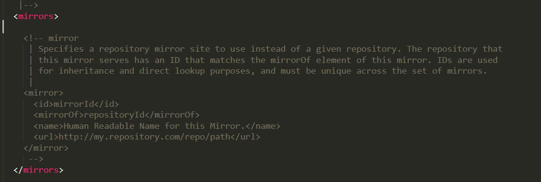 - 因为maven的默认下载地址在国外,所以会很慢,建议进入conf中的settings.xml配置文件进行如下修改,这样下载地址就会替换成国内镜像。
