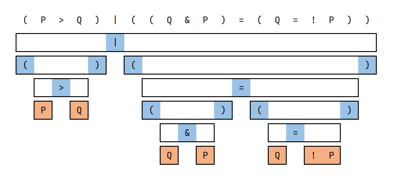 我们将 ! 运算去除,事情就简单得多。现在运算符只剩下 &, |, <=, == 这几种,并且它们都是等优先级的。复杂度瓶颈就在于如何快速构建出表达式树。