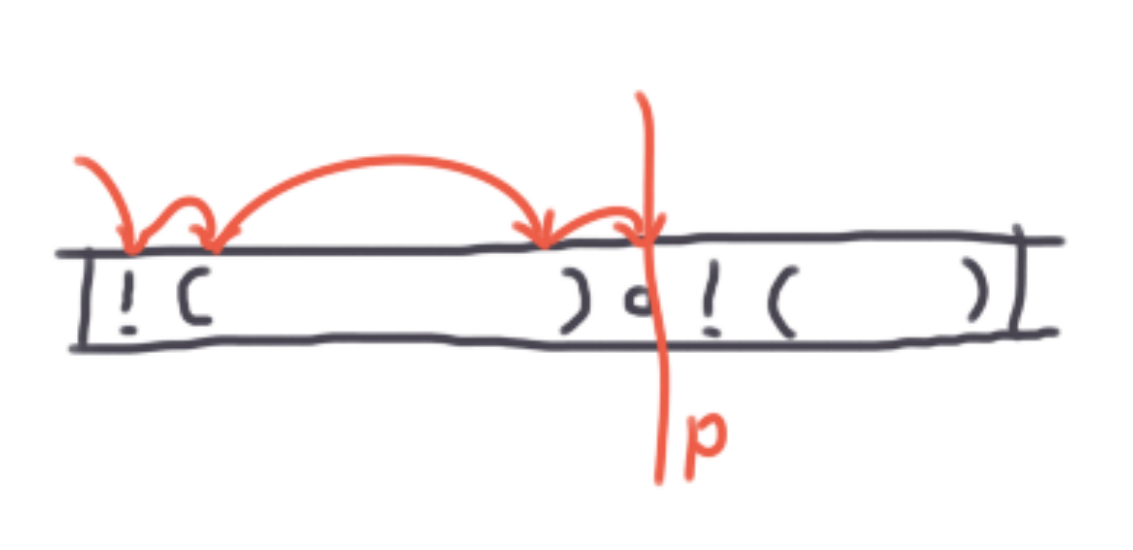 由于 ! 这个烦人的存在,我们从左往右扫的时候必须把第一个表达式之前的 ! 挨个点名。那么如果这一串 ! 很长很长的话,我们每次都要近似走 \(O(n)\) 格,复杂度就退化成了 \(O(n^2)\)