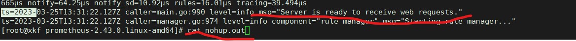 [root@xkf ~]# cd /usr/share/prome/prometheus-2.43.0.linux-amd64/ [root@xkf prometheus-2.43.0.linux-amd64]# nohup ./prometheus & [1] 6556 [root@xkf prometheus-2.43.0.linux-amd64]# nohup: ignoring input and appending output to ‘nohup.out’