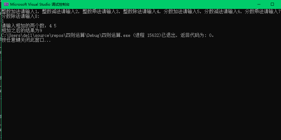 printf("整数加法请输入1,整数减法请输入2,整数乘法请输入3,整数除法请输入4,分数加法请输入5,分数减法请输入6,分数乘法请输入7,分数除法请输入8:\n");