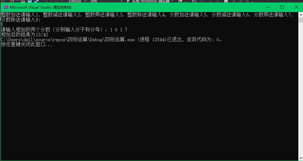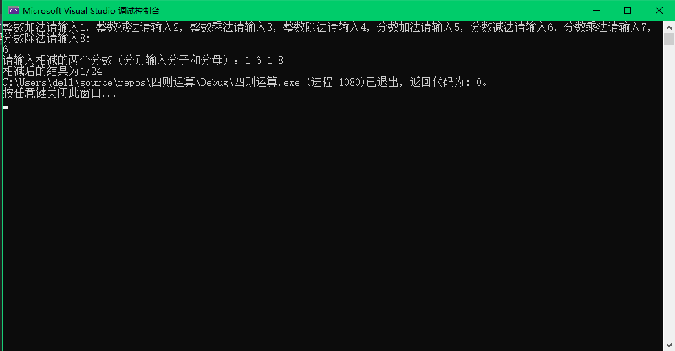 小结:在刚完成代码的时候,进行分数的四则运算时,输出的数据总是不对,并且输出的数据分子分母特别大,不知道什么原因,将scanf里面%d之间的逗号去掉,运行程序时也不输入逗号,数据与数据之间空格隔开后,结果终于正常,但是在整数的除法运算中输出的结果还是不是正确答案,虽然形式是对的,但是结果不对,修改多次数据类型后还是不行。