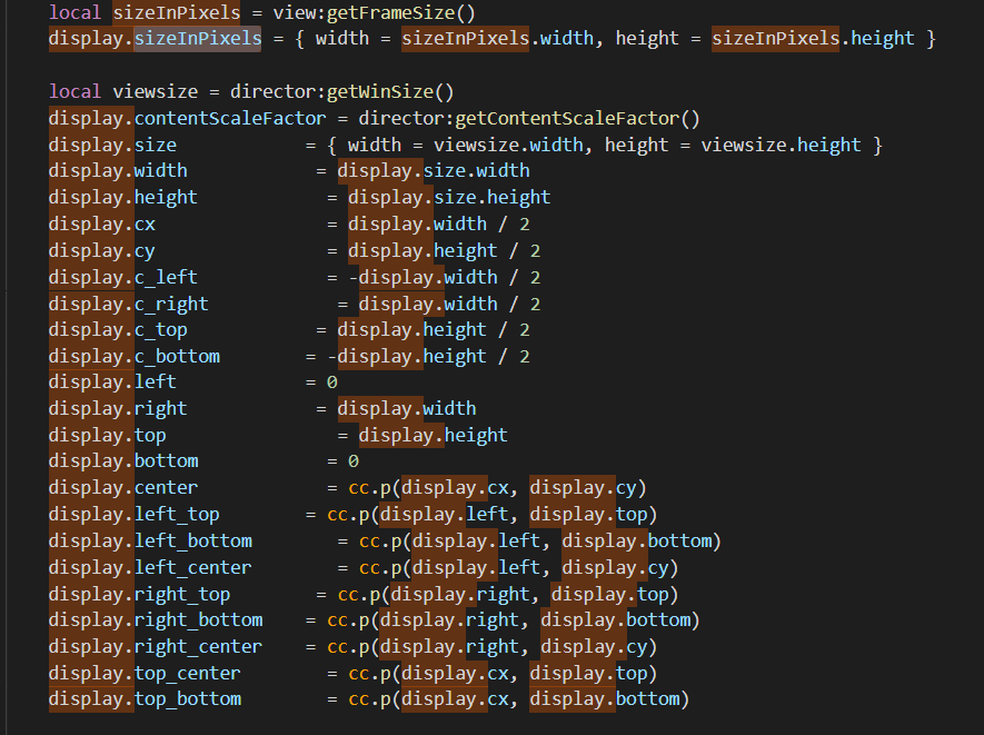 display 模块封装了大部分与显示有关的功能,并负责根据 config.lua 中定义的分辨率设定计算屏幕的设计分辨率。