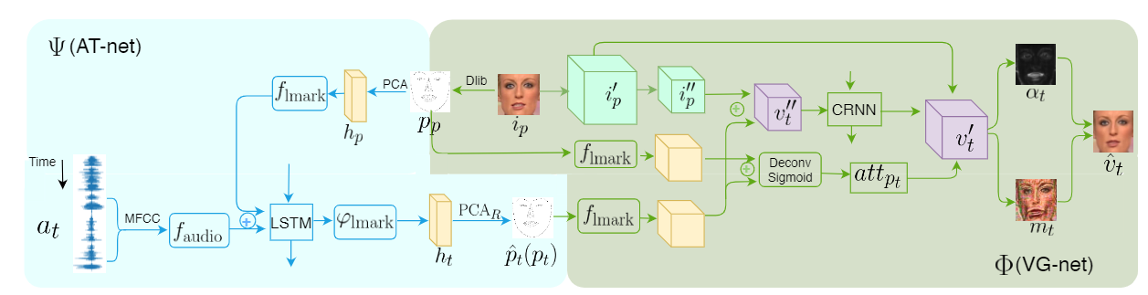 论文提出的模型输入为, 一个音源序列\(a_{1:T}\), 一个样例帧\(i_p\)和这个帧的landmarks\(p_p\). 模型会针对音源序列\(a_{1:T}\)生成其landmarks序列\(\hat{p}_{1:T}\)并生成连续的帧