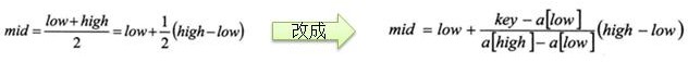- int mid = low + (high - low) * (key - arr[low]) / (arr[high] - arr[low]) ;/*插值索引*/