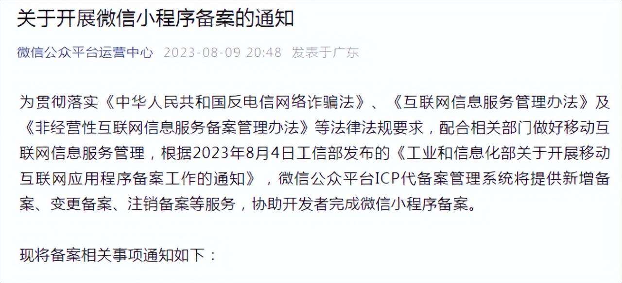 《中华人民共和国反电信网络诈骗法》、《互联网信息服务管理办法》及《非经营性互联网信息服务备案管理办法》等法律法规要求,配合相关部门做好移动互联网信息服务管理,根据2023年8月4日工信部发布的《工业和信息化部关于开展移动互联网应用程序备案工作的通知》,微信公众平台ICP代备案管理系统将提供新增备案、变更备案、注销备案等服务,协助开发者完成微信小程序备案。备案期限要求:
