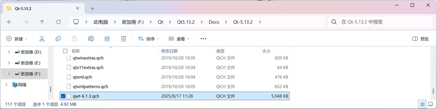 9. 第9和第10步是为qwt建立帮助文档,qwt-6.1.3.qch的下载地址为:https://pan.baidu.com/s/1WMbEIHk5Aip8iQFE9UPqkA?pwd=pv9r 提取码: pv9r 直接将其拷贝到文件夹 F:\Qt\Qt5.13.2\Docs\Qt-5.13.2 即可