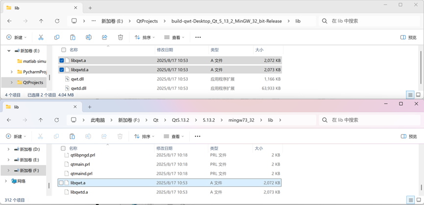 6. 将lib文件夹下的两个文件 libqwt.a 和 libqwtd.a 拷贝到Qt安装的lib文件夹 F:\Qt\Qt5.13.2\5.13.2\mingw73_32\lib