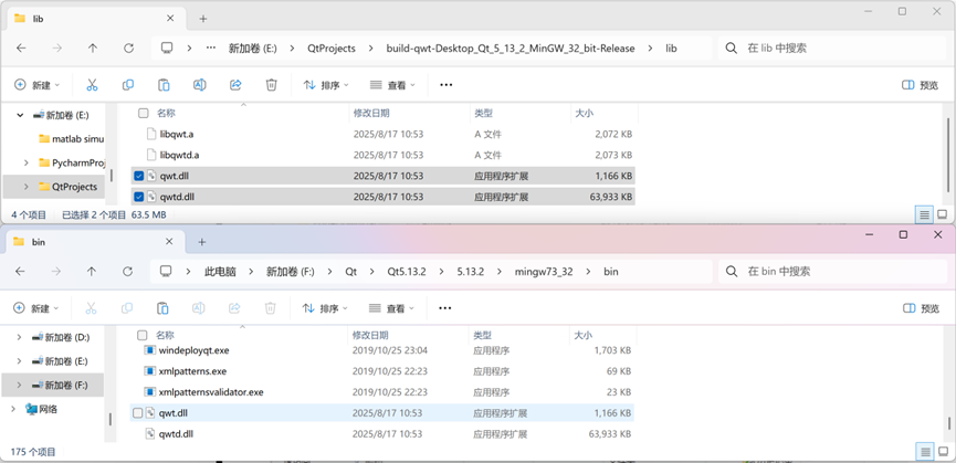 5. 将所构建的文件夹 E:\QtProjects\build-qwt-Desktop_Qt_5_13_2_MinGW_32_bit-Release 里面lib文件夹下的两个.ll文件 qwt.dll 和 qwtd.dll 拷贝到Qt的安装软件bin文件夹 F:\Qt\Qt5.13.2\5.13.2\mingw73_32\bin(注意:每个人的构建目录 E:\QtProjects\build-qwt-Desktop_Qt_5_13_2_MinGW_32_bit-Release 和Qt软件安装目录 F:\Qt\Qt5.13.2\5.13.2 可能不同,以自己的具体构建和安装目录为主,后面不再赘述)