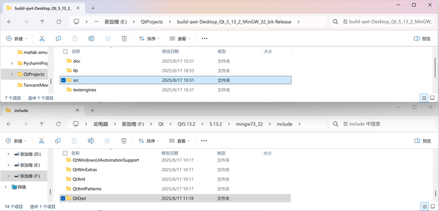 8. 将文件夹 E:\QtProjects\build-qwt-Desktop_Qt_5_13_2_MinGW_32_bit-Release下的src文件全部拷贝到文件夹 F:\Qt\Qt5.13.2\5.13.2\mingw73_32\include 并重新命名为 QtQwt