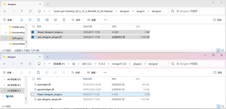 7. 将文件目录E:\QtProjects\build-qwt-Desktop_Qt_5_13_2_MinGW_32_bit-Release\designer\plugins\designer下的两个文件libqwt_designer_plugin.a 和 qwt_designer_plugin.dll 拷贝到文件夹 F:\Qt\Qt5.13.2\5.13.2\mingw73_32\plugins\designer
