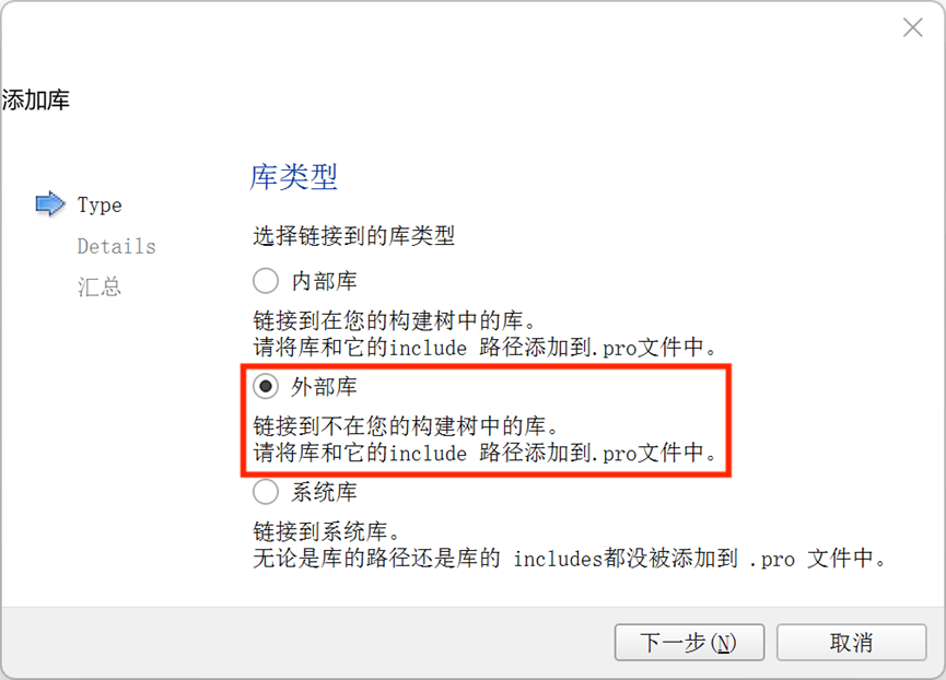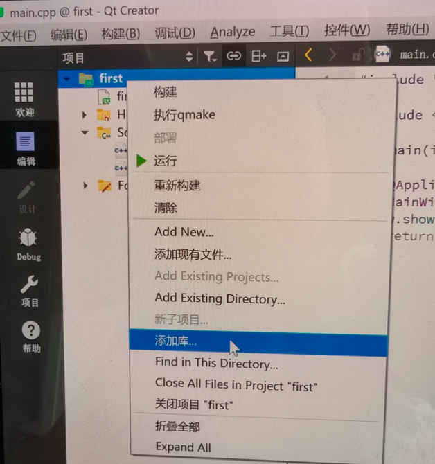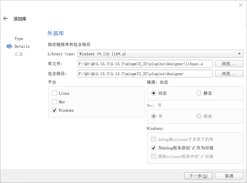 4. 右键单击项目名称,选择添加库,添加外部库,库文件选择Qt安装文件夹下的libquc.a文件,包含的路径为其中所在的文件夹,平台为Windows