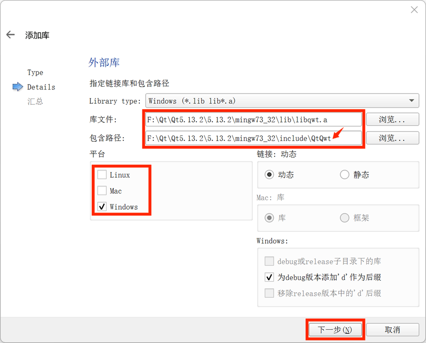 14. 按照目录选择刚刚添加在lib文件夹得libqwt.a文件,以及在include文件夹得QtQwt文件夹,平台是Windows