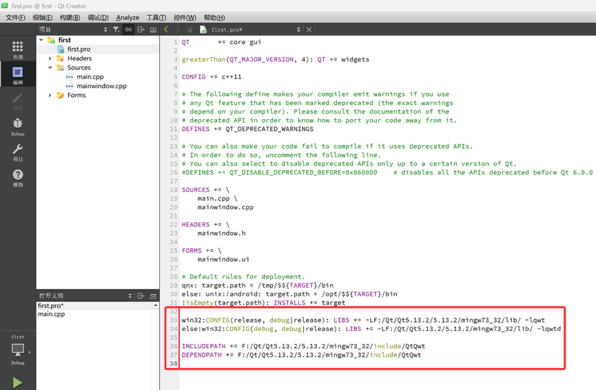15. 完成库得添加后,first.pro里面会多出一段配置代码