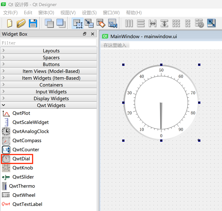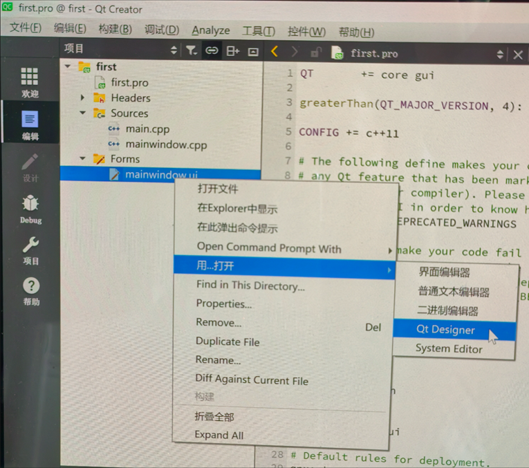 16. 在ui窗口文件添加控件,右键单击mainwindow.ui,选择Qt Designer