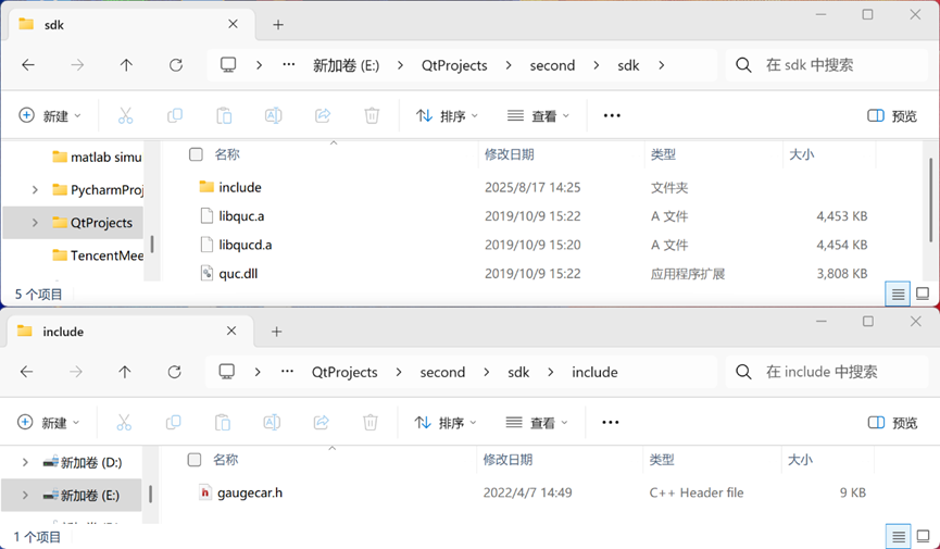 3. 在新建的Qt项目second中新建一个文件夹sdk,将 qt_5_13_1_mingw730_32 文件夹下得四个文件libquc.a、libqucd.a、quc.dll、qucd.dll 拷贝到这个文件夹,再在这个文件夹新建一个include文件夹,用来存放编码控件需要的头文件 (头文件需要自行查找)