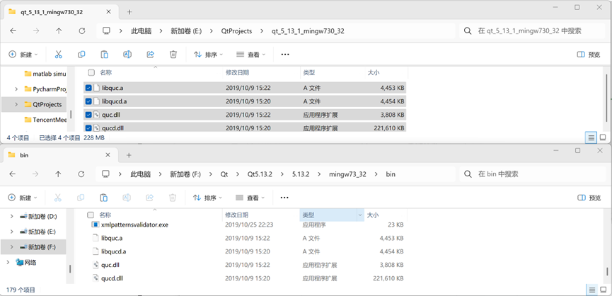 1. 将 qt_5_13_1_mingw730_32 文件夹下得四个文件libquc.a、libqucd.a、quc.dll、qucd.dll 拷贝到文件夹 F:\Qt\Qt5.13.2\5.13.2\mingw73_32\bin