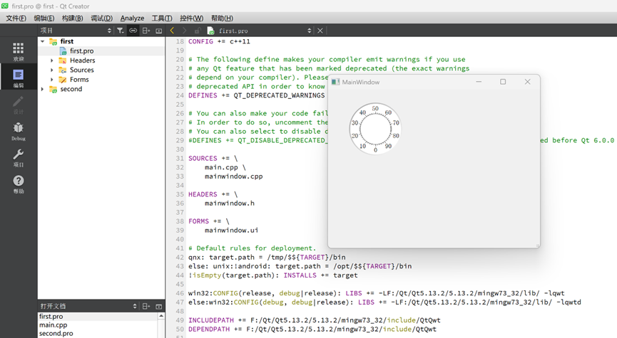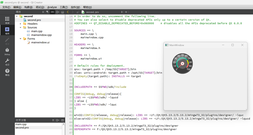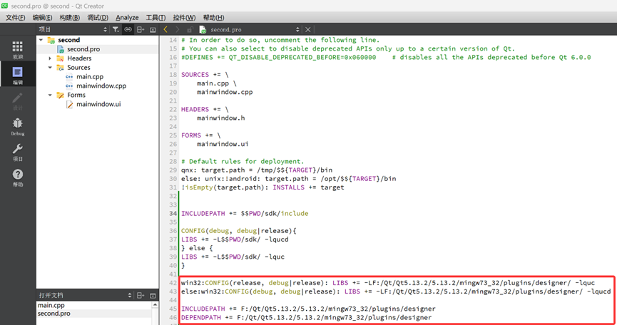 5. 添加完成库之后,second.pro文件里面会出现一些新的配置代码(注意:这些新添加的代码去掉也能实现相应功能,第34-40行代码已经进行了配置)