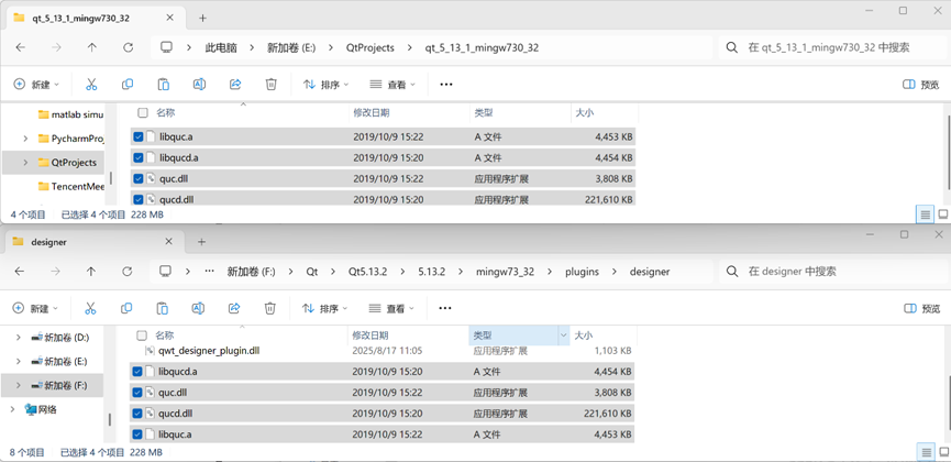 2. 将 qt_5_13_1_mingw730_32 文件夹下得四个文件libquc.a、libqucd.a、quc.dll、qucd.dll 拷贝到文件夹 F:\Qt\Qt5.13.2\5.13.2\mingw73_32\plugins\designer
