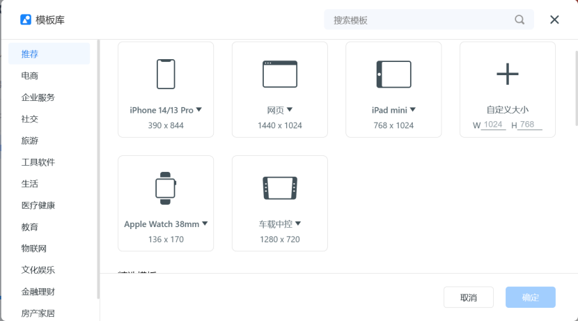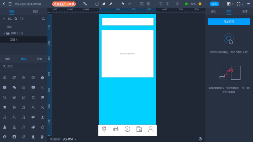 2.进入编辑界面后选择设计的设备的界面大小即可开始进行编辑,我组的设计主要用于移动端,在这里选择了华为P30的界面大小。