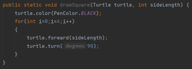 turtle.turn(double degrees) 将turtle顺时针旋转degrees度,其中degrees采用角度制