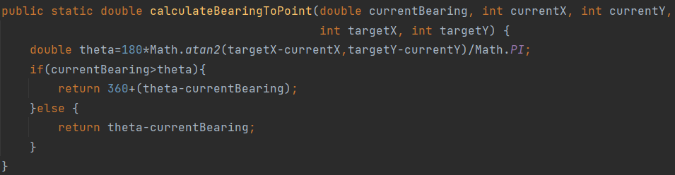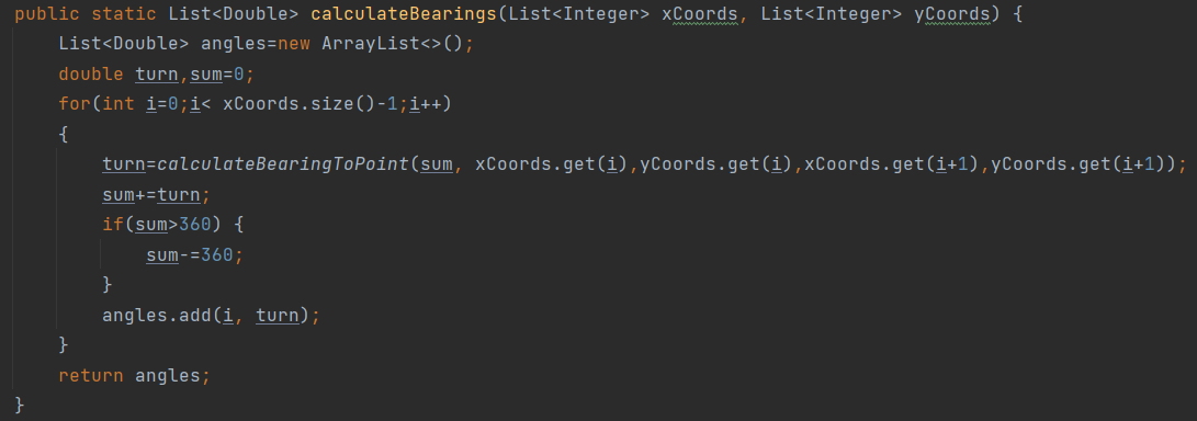 由于需要计算角度,且提供的点坐标为double型,故定义了一个dcalculateBearingToPoint方法,它与calculateBearingToPoint的唯一不同之处是它接受的点坐标为double型