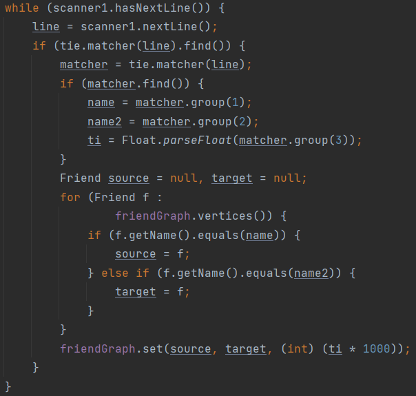 这里复用了实验二的图,用于表示用户之间的关系。由于实验二中边的权值为整数,而这里的社交亲密度小数点后最多三位,故将权设为(int)(社交亲密度*1000)