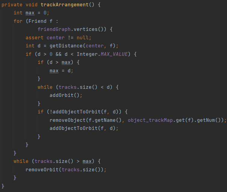 对于TrackGame及AtomStructure,这样就完成了。但SocialNetworkCircle还需要画出关系,于是建立一个Map<Friend,Point> position来记录每个轨道物体在界面中的位置,然后再画出关系即可。