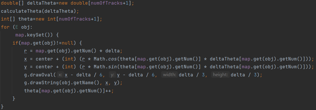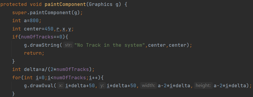 重写父类的paintComponent方法以进行绘制。首先均匀地画出轨道,使得相邻的轨道的半径差相等,为delta