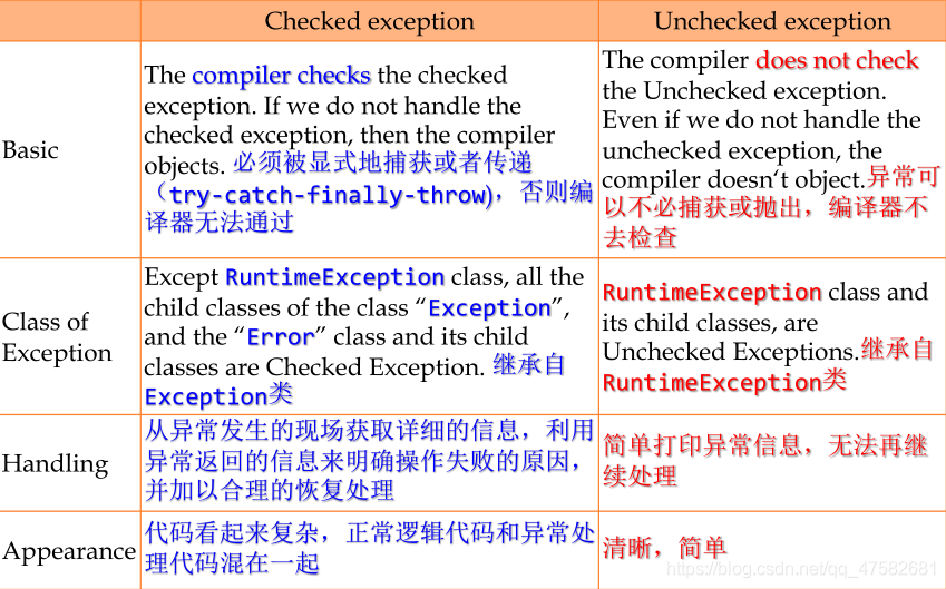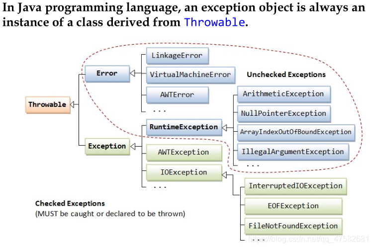 异常按是否能在编译时被发现分为UncheckedExcptions和CheckedException,其中CheckedExcecption必须被捕获或者声明(因为运行异常有jvm处理,编译异常则不行,所以必须自定义处理逻辑)。