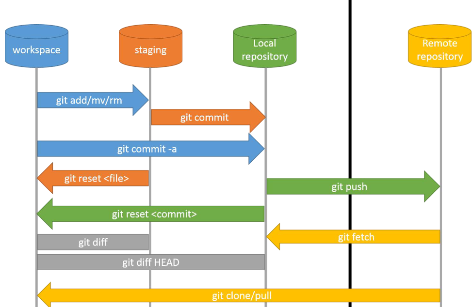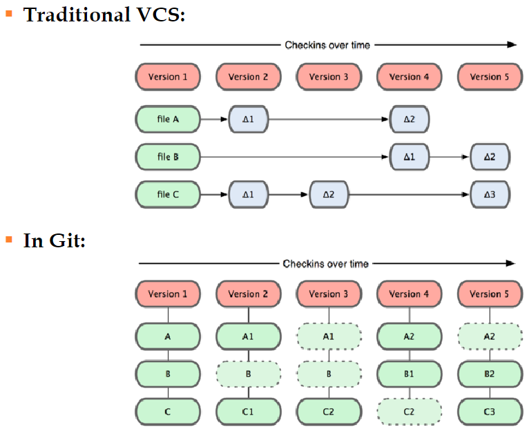 传统VCS存储版本之间的变化(行),git存储发生变化的文件而非代码行,不变化的文件不重复存储。