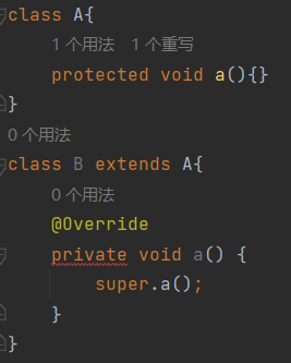重写方法的访问权限不能比原方法更严格,但可以变宽松: