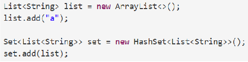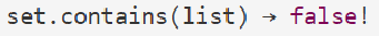 原因:set是按哈希值存储的,当list被加入时,它被放在它的哈希值所对应的位置;list被更改后,其哈希值也随之更改,但它在set中的位置没有改变,所以contains方法无法找到list