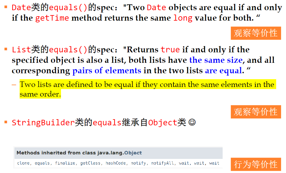 对可变类型,往往倾向于实现严格的观察等价性,如集合类采用观察等价性,但StringBuilder使用行为等价性