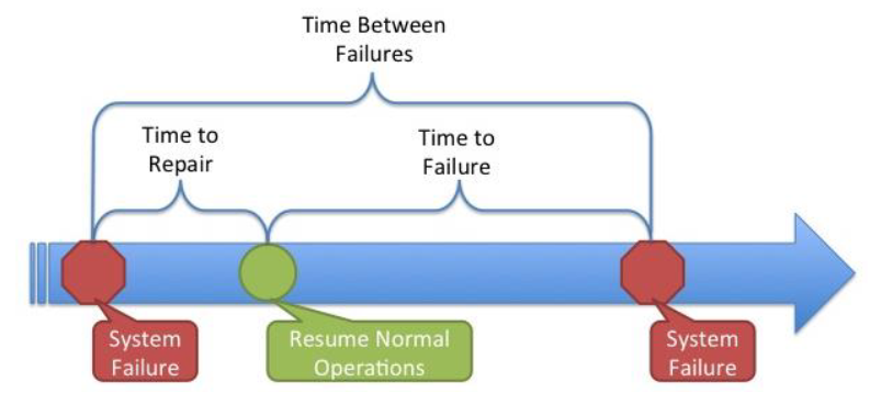 平均失效间隔时间(MTBF):相邻两次故障之间的平均工作时间