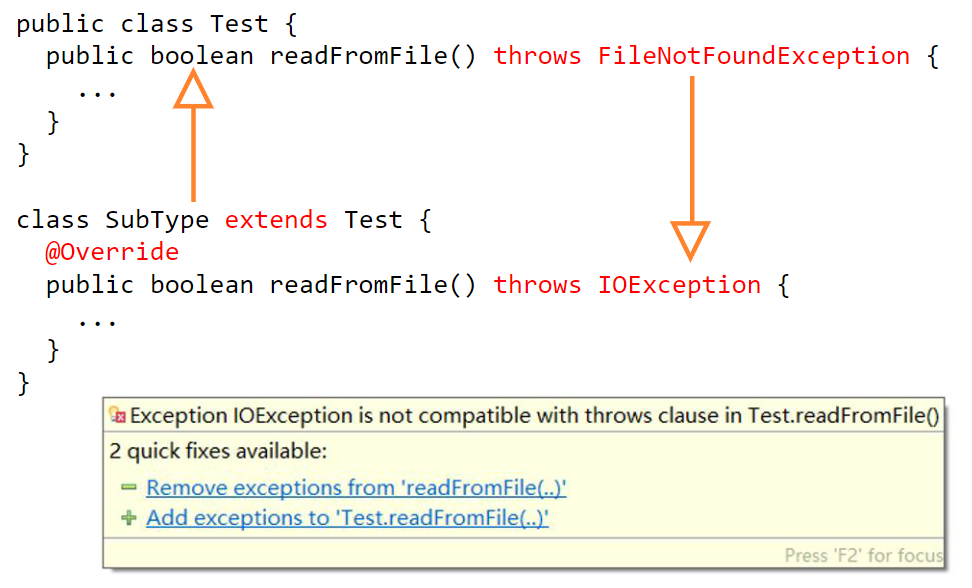 如果子类型中override了父类型中的函数,那么子类型中方法抛出的异常不能比父类型抛出的异常类型更宽泛