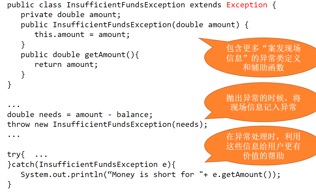 可以给异常类添加额外信息并在捕获时获取信息,以便于调试: