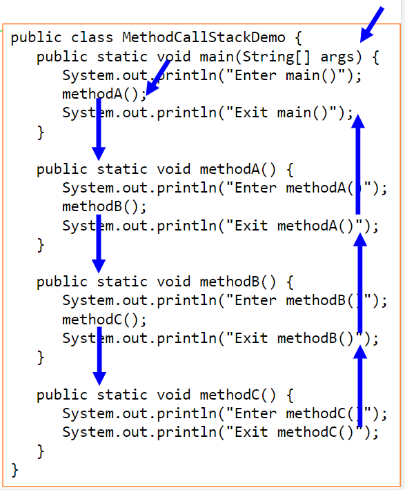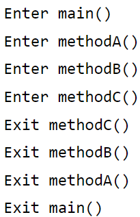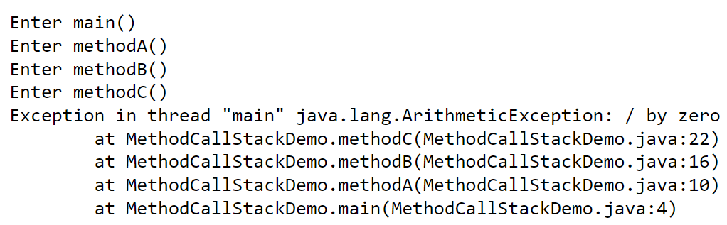 异常发生后,如果找不到处理器,就终止执行程序,在控制台打印出stack trace(最上一行是异常发生的“第一现场”,接下来每行为上一行被调用的位置)