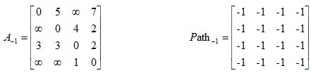 给出矩阵,其中矩阵A是邻接矩阵,而矩阵Path记录u,v两点之间最短路径所必须经过的点